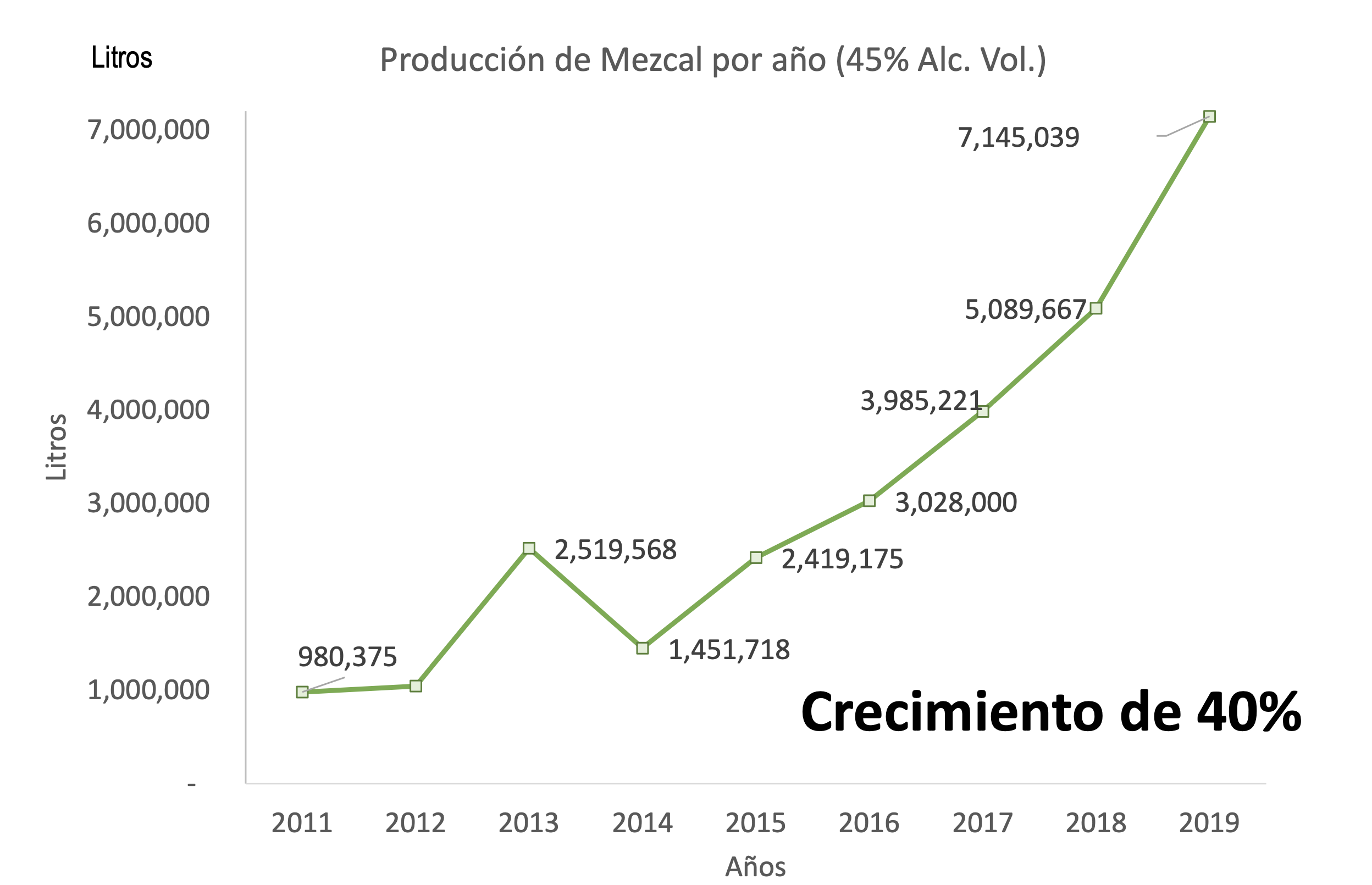 Existe una fuerte demanda en los EE. UU. y México por este interesante y complejo destilado de maguey compuesto de hipótesis, mitologías, historia, talento, cultura y tradición. El crecimiento en Europa y Asia ya ha comenzado y aunque es aun tímido, no se va a detener. En 2019 (las cifras del 2020 aun no se han hecho públicas hasta hoy 3/22/21) se produjeron mas de 7 millones de litros en los 9 estados que componen la Denominación de Origen Mezcal (DOM). Dicha DO, esta compuesta de los siguientes nueve Estados: Oaxaca, Puebla, Guerrero, Michoacán, Guanajuato, San Luis Potosí, Tamaulipas, Zacatecas y Durango.