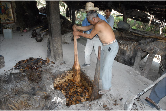Desde que Casiano se lastimó fuertemente la espalda, moliendo mezcal con un mazo en un palenque aledaño dejó de trabajar. Lo hizo durante años. Dicen que era bueno para ello, pero desafortunadamente un nervio fue machucado por una vértebra y no pudo más trabajar. Sin darle ni un centavo de compensación por los diez años trabajados le dieron las gracias. Hoy es una máquina desgarradora que hace su trabajo.