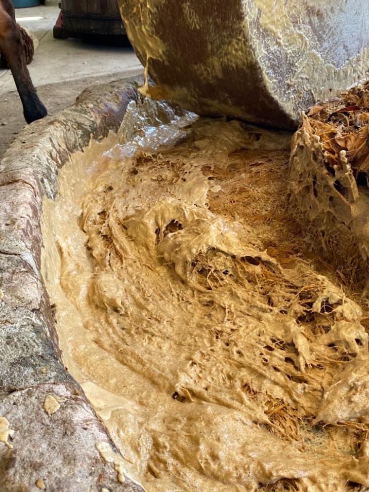 Once the maguey is cooked in underground conical ovens or masonry ovens, it is ground using different methods depending on the region and the producer. In some places, it is ground finely, while in others, it is left coarser. This decision is made by the Maestro Mezcalero, and it significantly influences the fermentation time. Immediately afterward, the ground agave is placed in open vats where warm water (40°C) is added, marking the beginning of the most fascinating part of mezcal production: fermentation.